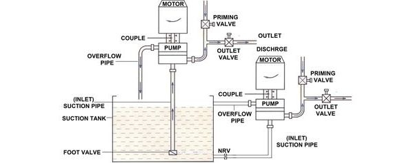 • Close outlet valve and open priming valve, fill the water in priming valve pipe until complete suction pipe fill up and water comes from the overflow pipe.